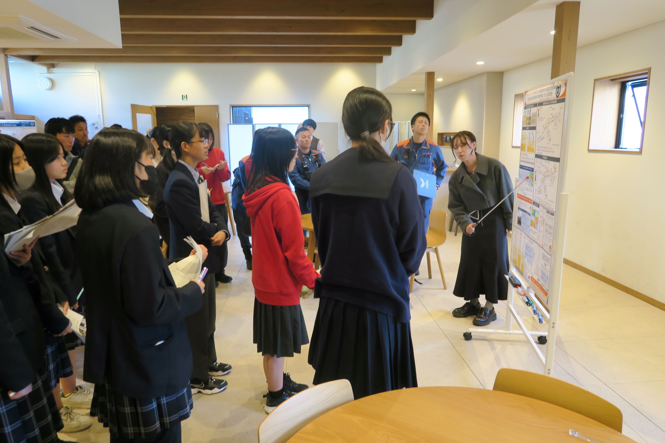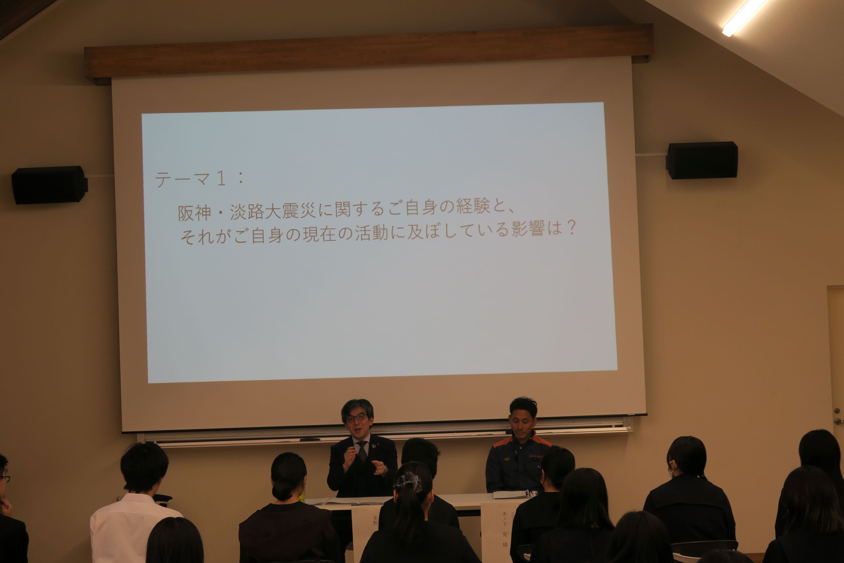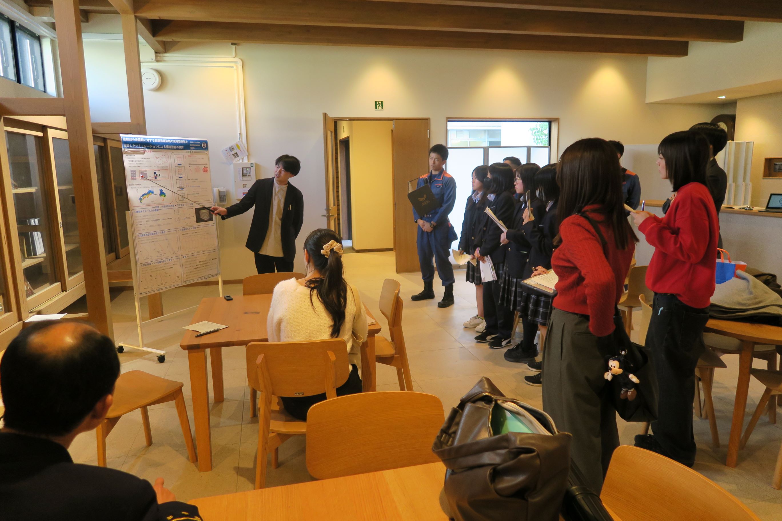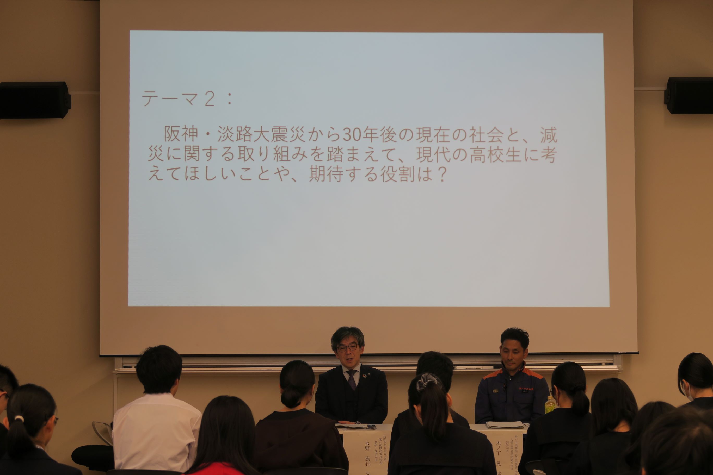 11/3(月・祝)県立長田高校が五国SSH連携プログラム*担当校として開催した第3回「高校生のための減災復興学フォーラム」に、永野教授と永野研究室の院生と学部生(環境人間学部、荘所研)が参加しました。午前の部では永野教授が『「減災復興学という学問の概要と、減災・防災に取り組む高校生に期待すること」』を講義し、午後の部では永野教授と長田消防署の消防指令の方とのトークセッション、発表交流①②③④が行われました。今年度は、参加生とらによるポスター発表交流が行われました。兵庫県立大学からは、M2の三田君とB4の河村さんが発表しました。